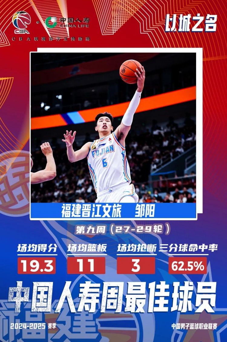CBA聯(lián)賽官方宣布,鄒陽(yáng)當(dāng)選2024-2025賽季常規(guī)賽第九周的周最佳球員。