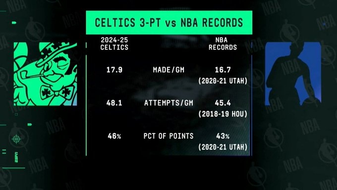 2025-03-09 22:20:00現象級!綠軍本季場均三分出手&命中數&得分占比 都高于歷史紀錄