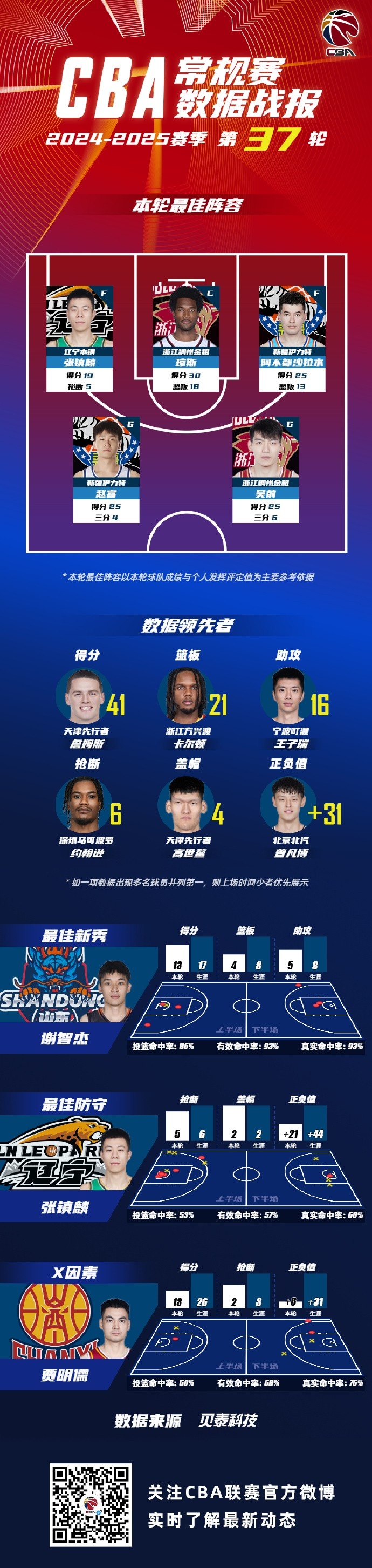 2024-2025賽季CBA聯賽常規賽第37輪結束較量,來自遼寧沈陽三生飛豹籃球俱樂部的張鎮麟 ,浙江稠州籃球俱樂的瓊斯和吳前 ,新疆廣匯籃球俱樂部的阿不都沙拉木和趙睿入選CBA聯賽常規賽第37輪最佳陣容!