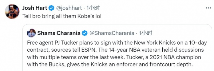 2025-03-09 22:21:13塔克10天合同簽尼克斯!哈特調侃:兄弟把你的科比鞋都帶上