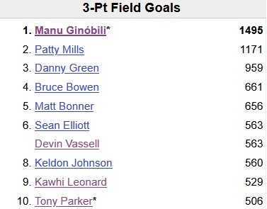 2025-03-11 12:18:40瓦塞爾馬刺生涯三分數超越埃利奧特 獨占隊史第6位&馬努高居榜首