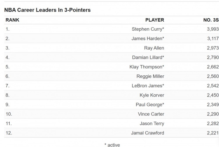 在斯蒂芬-庫里橫空出世之前,職業(yè)生涯投進3000記三分球似乎是一個遙不可及的目標。