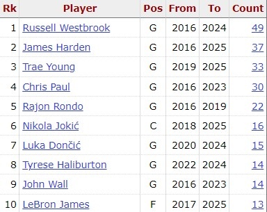 2025-03-18 12:21:54威少過去10個賽季50次半場助攻上雙 同期最多 哈登37次第二