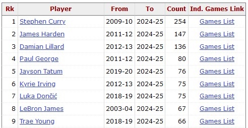 2025-03-19 18:26:53吹楊生涯67次至少30分+5三分 與詹姆斯并列歷史第8&庫里斷檔第一
