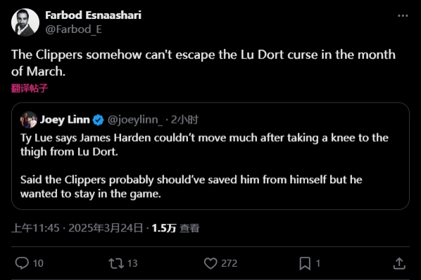 快船隊(duì)記Farbod Esnaashari發(fā)推表示:“快船在三月份似乎無(wú)法擺脫盧-多特的魔咒。”