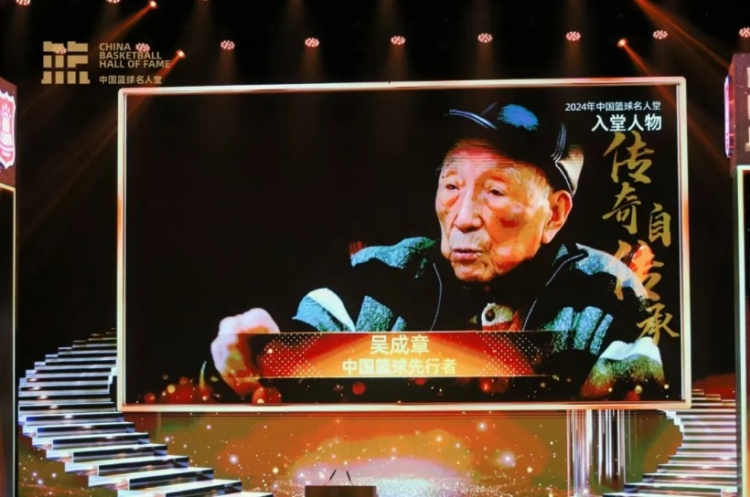 現年101歲的吳成章老人是李震中先生1948年奧運會的隊友,雖然無法親臨現場,他仍通過視頻表達了自己進入名人堂的喜悅。吳老之子吳忻水代父親領取名人堂徽章,并分享了他們之間的“父子籃球”軼事。