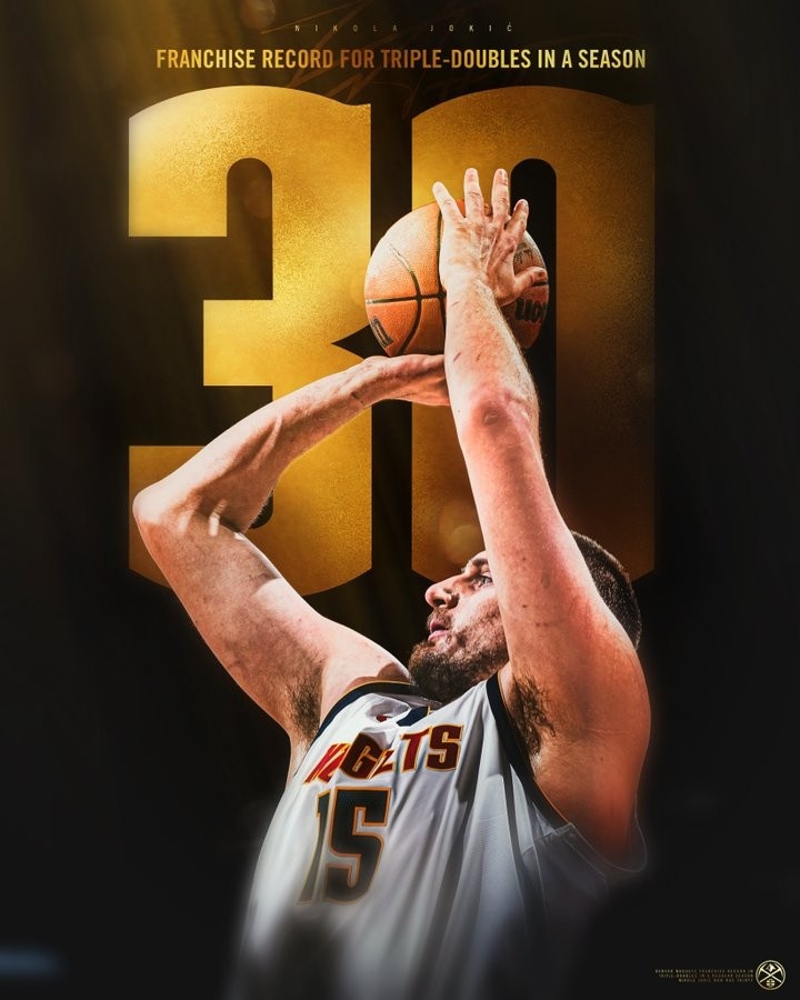 2025-03-27 12:32:07打破自己保持的隊史紀錄!掘金官方曬海報:約基奇單季30次三雙!