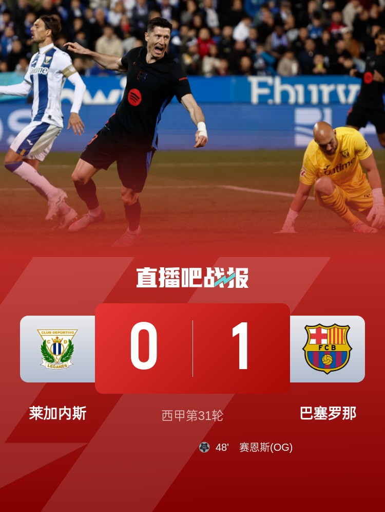 西甲第31輪,巴薩客場1-0戰勝萊加內斯,拉菲尼亞造烏龍。