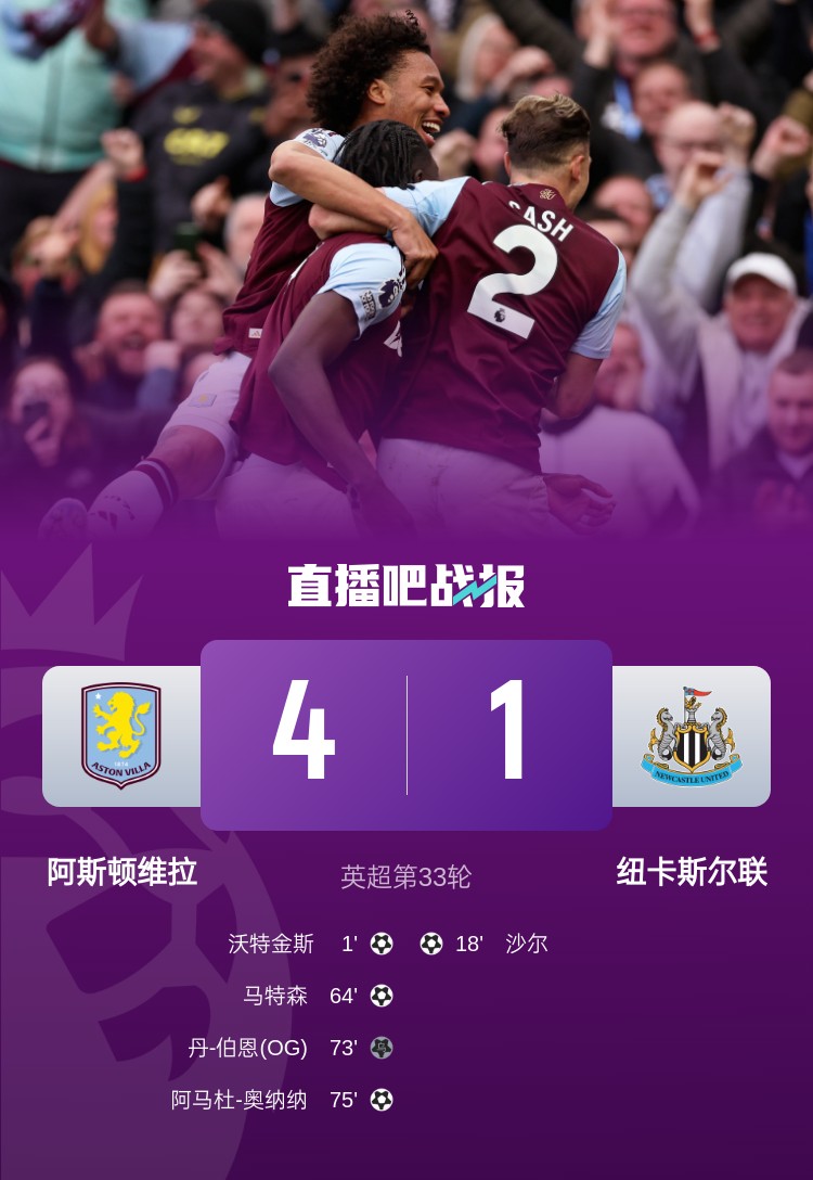 英超聯(lián)賽第33輪,阿斯頓維拉4-1大勝紐卡斯?fàn)柭?lián),沃特金斯傳射,馬特森進(jìn)球。