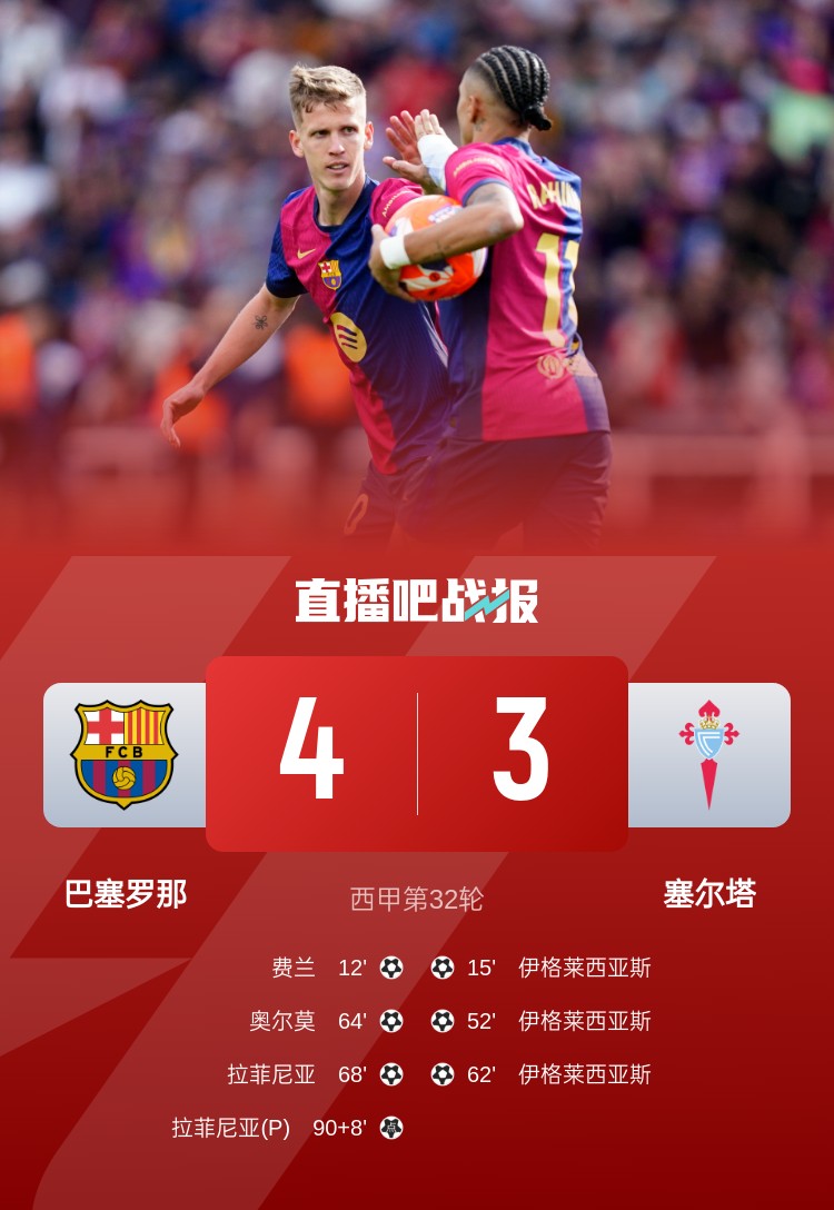 西甲聯(lián)賽第32輪,巴塞羅那連進(jìn)三球4-3塞爾塔,奧爾莫造點(diǎn),拉菲尼亞點(diǎn)射絕殺,伊格萊西亞斯帽子戲法。