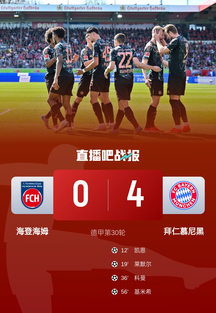 德甲第30輪,拜仁客場4-0大勝海登海姆,凱恩、萊默爾、科曼、基米希進(jìn)球。