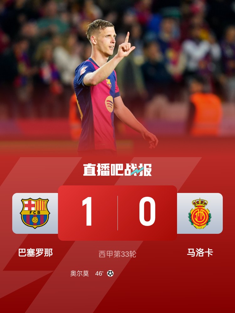 西甲第33輪,巴薩1-0馬洛卡,聯賽三連勝。上半場,奧爾莫中柱,巴薩轟24腳射門依然未能進球;下半場,埃里克-加西亞助攻奧爾莫破門,亞馬爾失單刀。