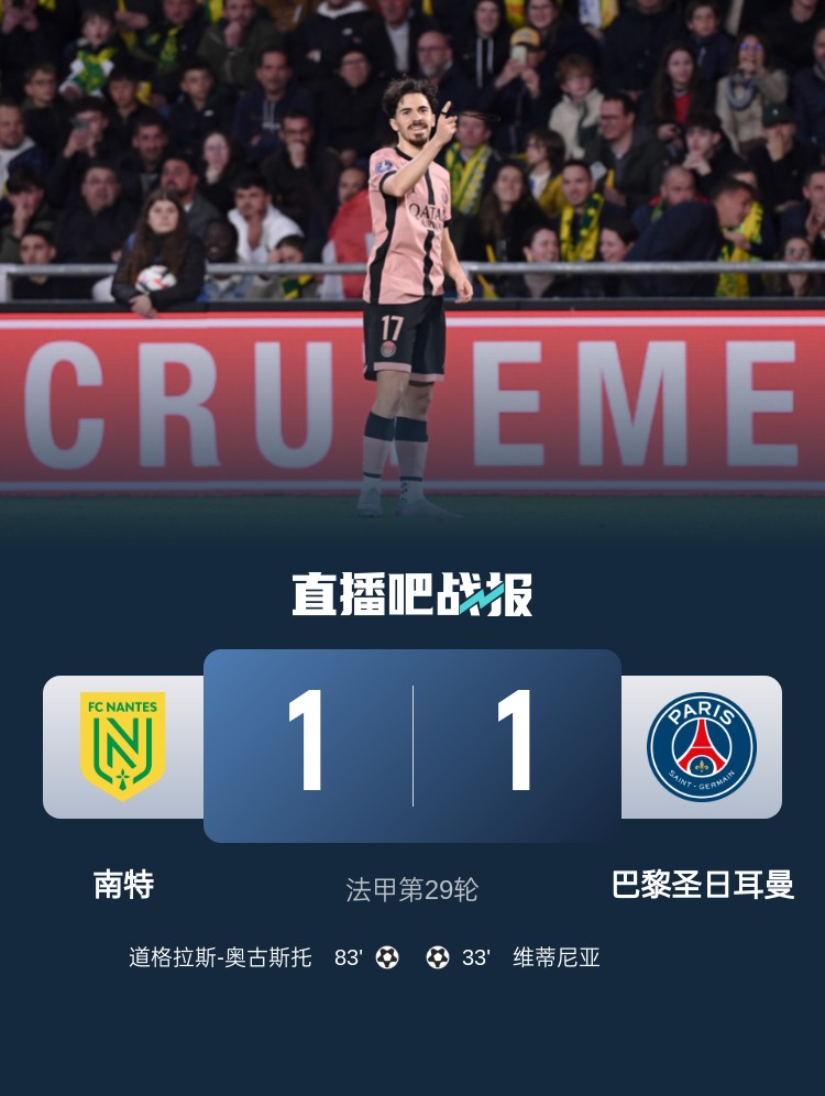 法甲第29輪,巴黎1-1戰平南特。上半場,維蒂尼亞幫助巴黎取得領先;下半場,道格拉斯-奧古斯托幫助南特扳平。