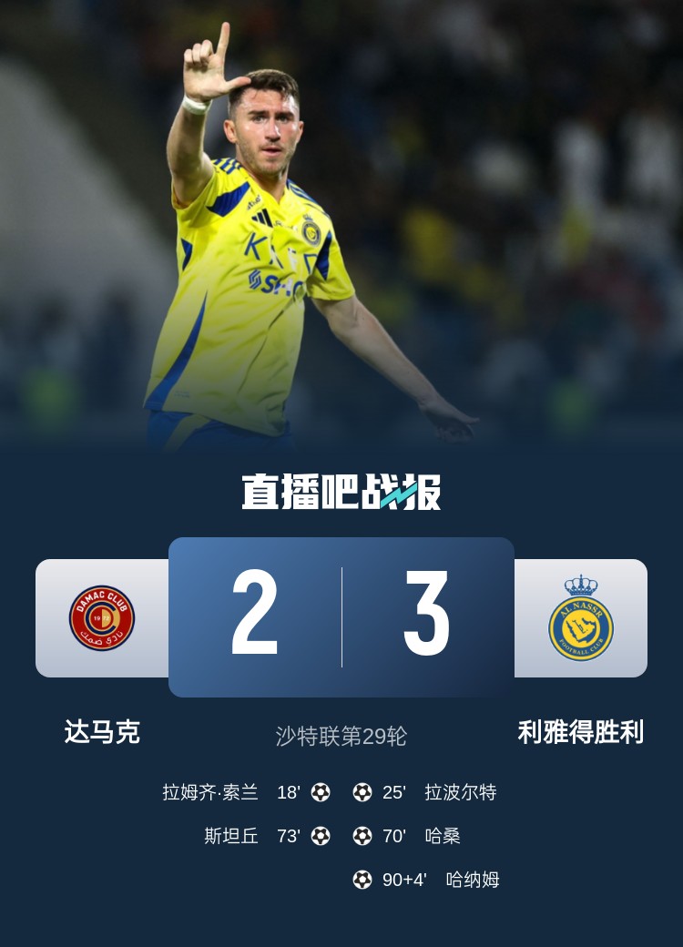 沙特聯第29輪,利雅得勝利客場3-2逆轉達馬克。上半場,索蘭先拔頭籌,拉波爾特扳平比分;下半場,哈桑替補反超,斯坦丘3分鐘追平,哈納姆補時94分鐘絕殺。