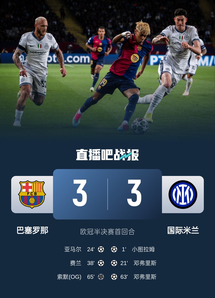 歐冠半決賽首回合,巴薩主場3-3戰平國米。上半場,小圖拉姆開場30秒閃擊,鄧弗里斯側鉤破門,亞馬爾1v5兜射破門,費蘭扳平比分;下半場,鄧弗里斯頭球完成雙響,拉菲尼亞遠射造索默烏龍;姆希塔良破門因腳尖越位無效,亞馬爾似傳似射第二次中橫梁。