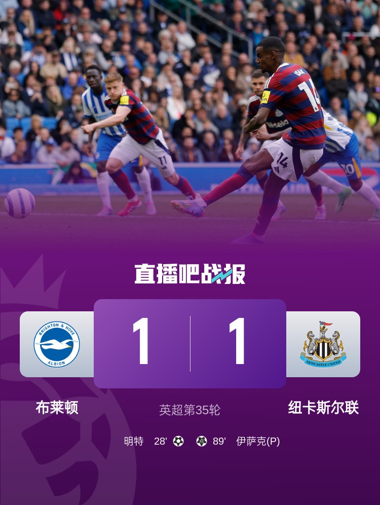英超第35輪,布萊頓1-1紐卡。上半場,明特內切兜射破門;下半場,紐卡斯爾聯兩度獲得點球經VAR回放后取消,阿亞里手球送點,伊薩克點球扳平比分。