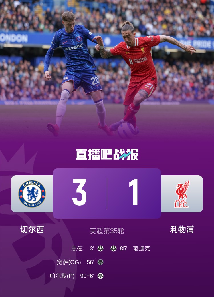 英超第35輪,切爾西3-1擊敗利物浦。上半場,恩佐開場3分鐘破門,薩拉赫錯失良機,凱塞多傳球擊中橫梁;下半場,寬薩自擺烏龍,帕爾默幾乎0度角射中立柱,范迪克頭球扳回一球,凱塞多補時造點,帕爾默主罰點球命中。