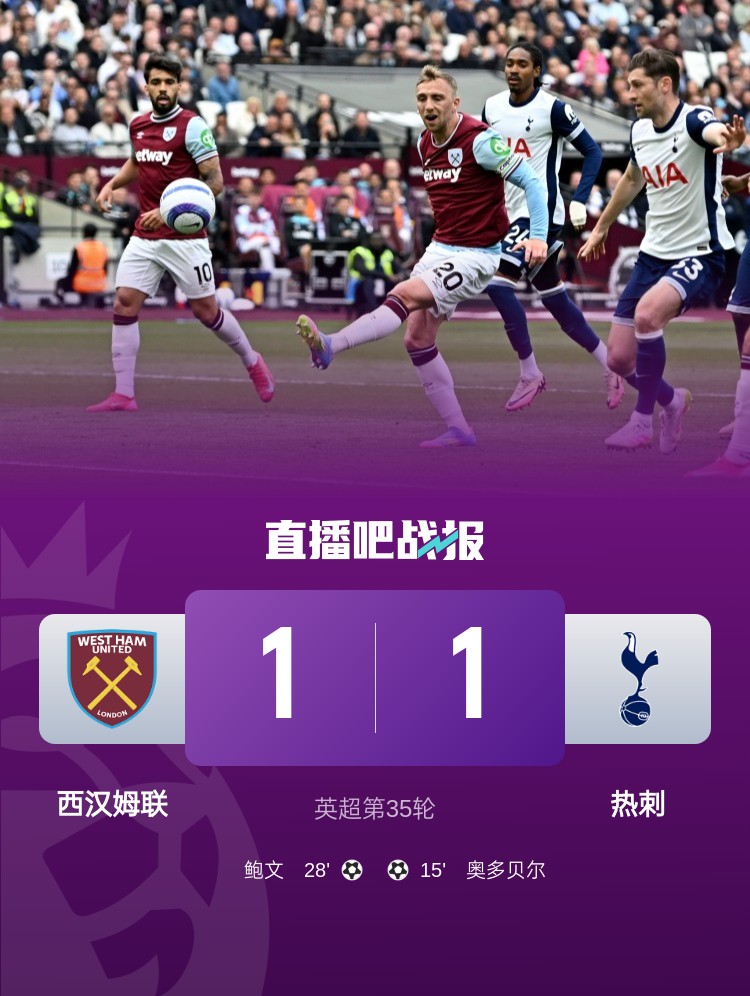 英超第35輪,熱刺1-1西漢姆聯賽止三連敗。上半場,基爾曼解圍失誤特爾助攻奧多貝爾推射首開記錄,鮑文小角度推射扳平比分;下半場,維卡里奧獻精彩撲救,帕奎塔疑似對判罰不滿落淚。