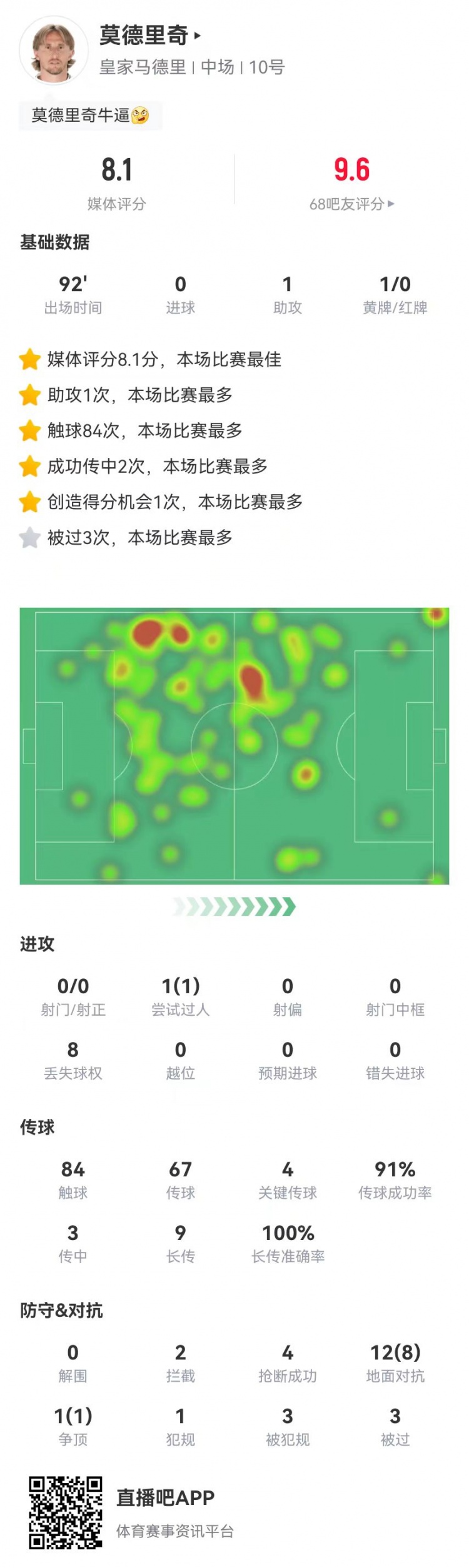 2025-03-10 06:01:13莫德里奇本場1助攻4關鍵傳球 10長傳9成功 13對抗9成功 8.1分最高