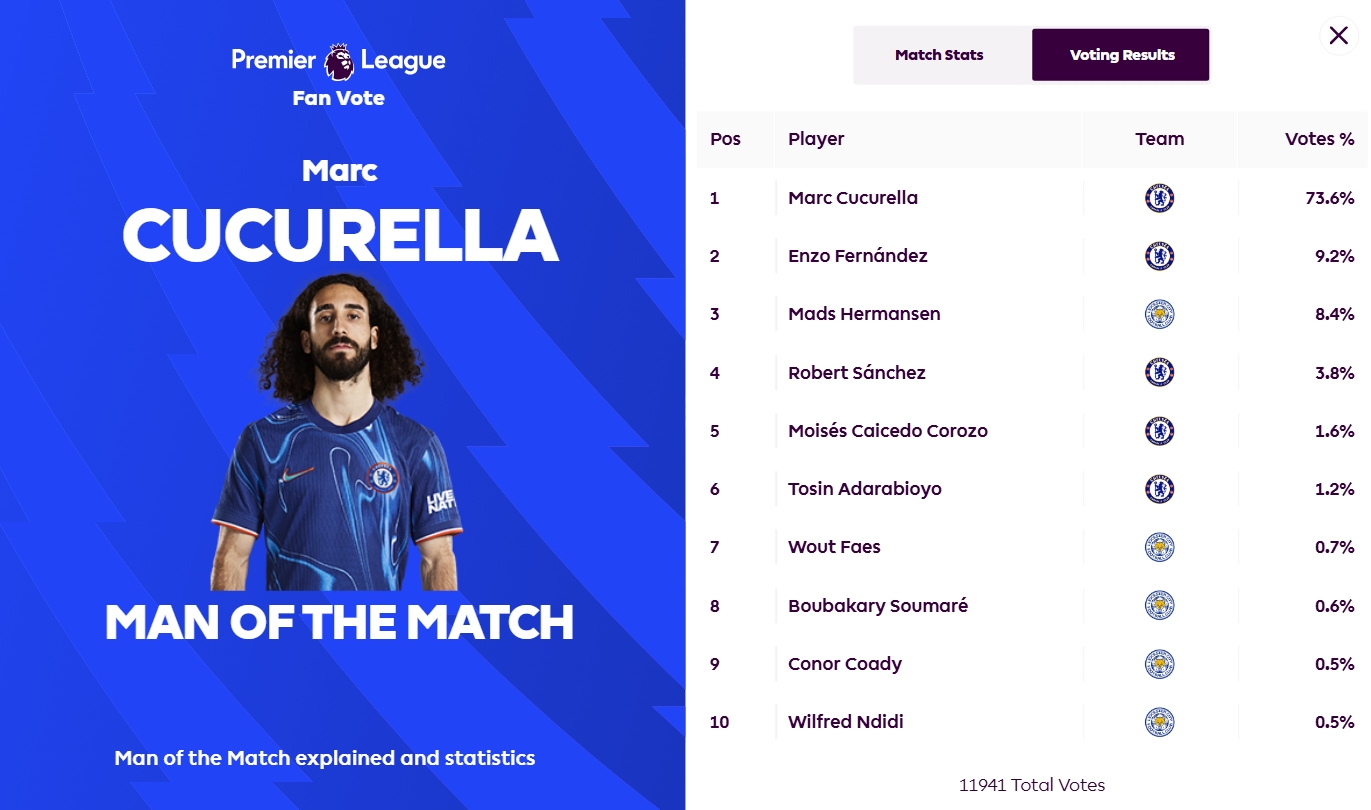 2025-03-10 06:01:39制勝進球!庫庫雷利亞73.6%得票率當選切爾西1-0藍狐一役全場最佳