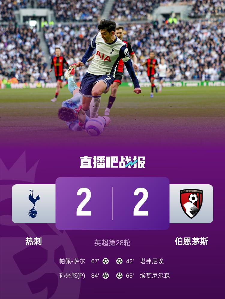 熱刺2-2戰平伯恩茅斯,薩爾、孫興慜破門,熱刺未能主場全取3分。