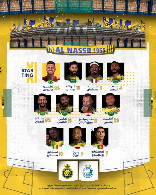 利雅得勝利首發:24-本托、12-納瓦夫、3-西馬坎、4-法蒂爾、83-納吉迪、19-哈桑、11-布羅佐維奇、23-葉海亞、10-馬內、9-杜蘭、7-C羅