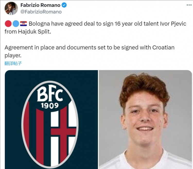 2025-03-11 18:00:41羅馬諾:博洛尼亞簽下克羅地亞16歲天才伊沃爾-普耶維奇