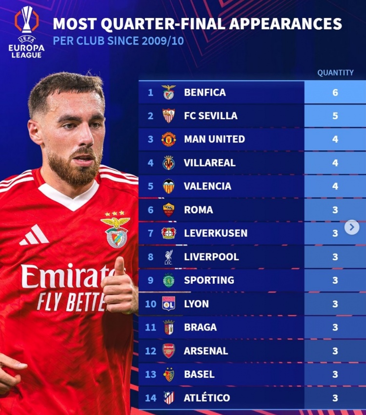 2025-03-14 12:01:38歐聯改制后晉級八強次數榜:塞維利亞5次、曼聯4次,軍槍競各3次