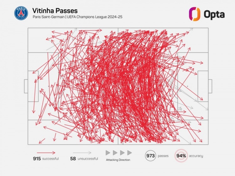 2025-03-14 12:01:46維蒂尼亞單賽季歐冠成功傳球已915次,近21年中場僅哈維等4人做到