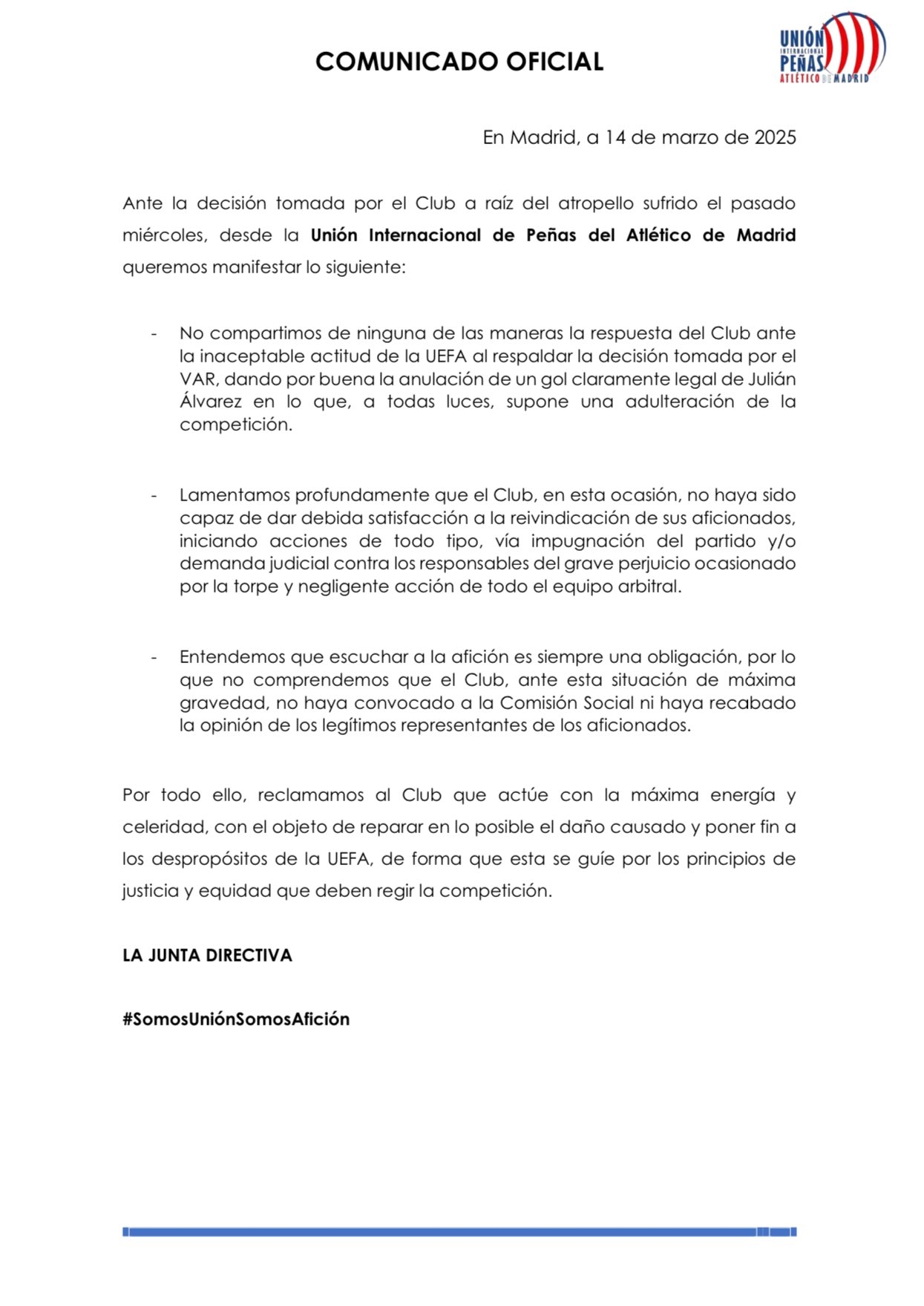 鑒于俱樂部因上周三發生的事件所做出的決定,馬德里競技國際球迷會聯盟希望表達以下立場: