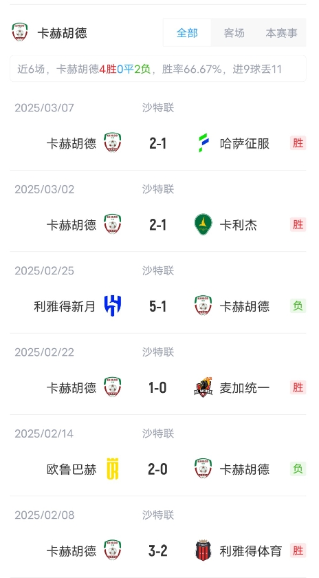 目前利雅得勝利取得了14勝6平4負的成績,積48分,暫居聯(lián)賽第4。卡赫胡德取得了9勝4平11負成績,積31分,暫居聯(lián)賽第10。