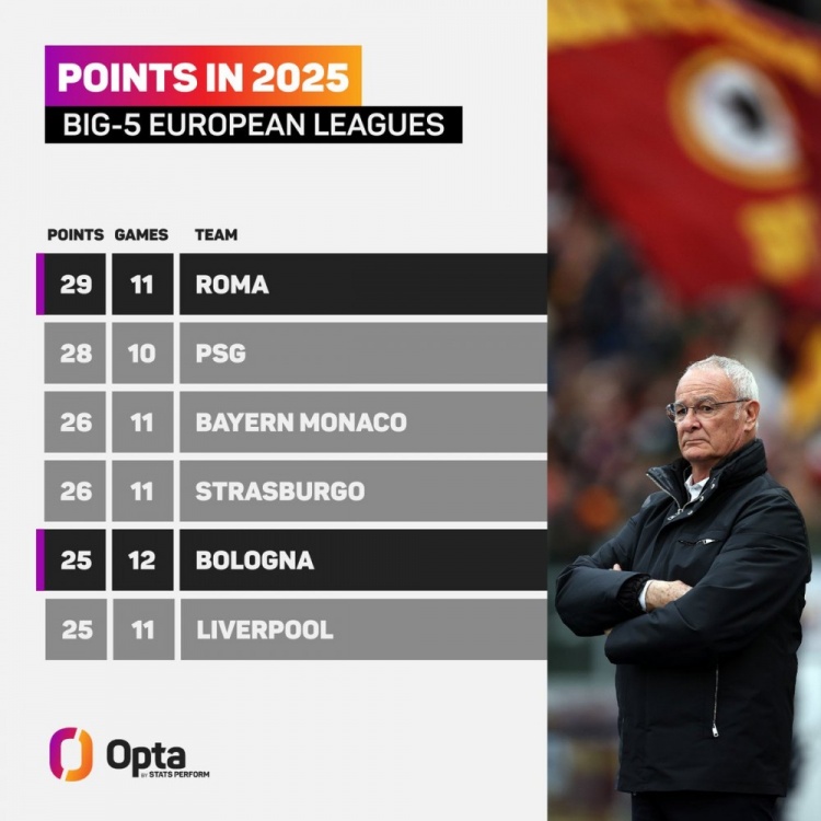 2025-03-18 06:00:09補(bǔ)天!2025五大聯(lián)賽拿分榜:羅馬壓巴黎居首,拜仁、利物浦在列