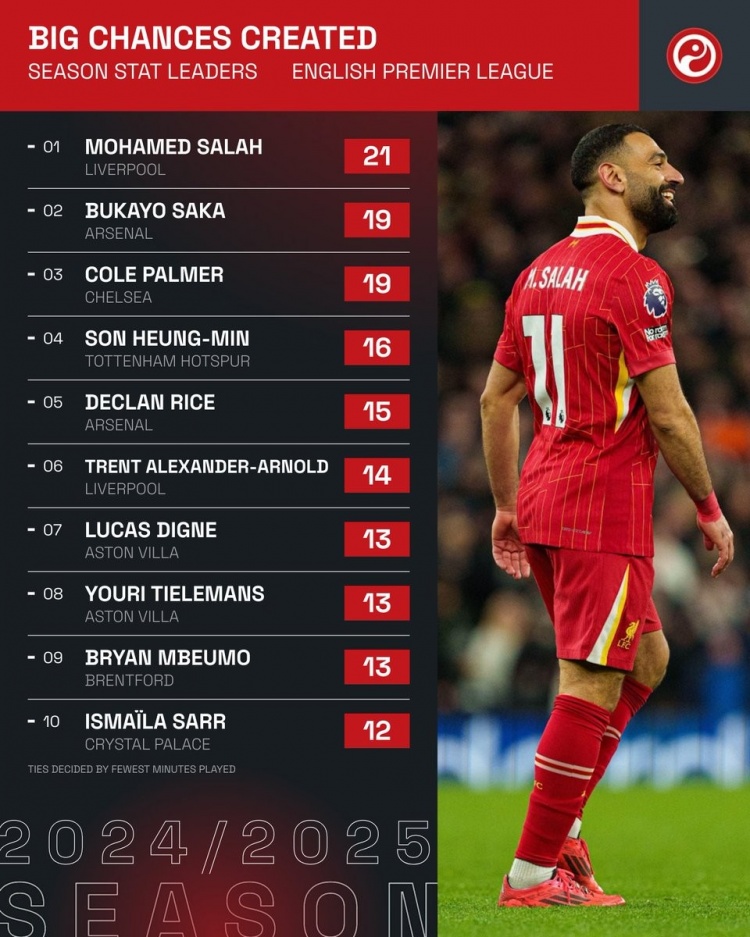 2025-03-18 06:00:22本賽季英超創(chuàng)造重大機(jī)會榜:薩拉赫21次居首,薩卡&帕爾默19次