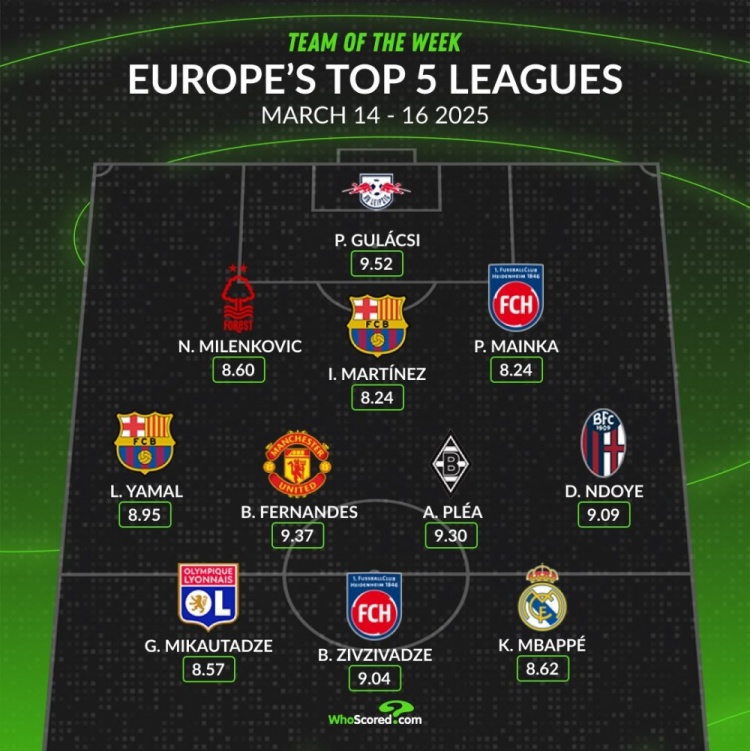 2025-03-18 06:00:28whoscored本周五大聯賽最佳陣:B費領銜,姆巴佩、亞馬爾在列