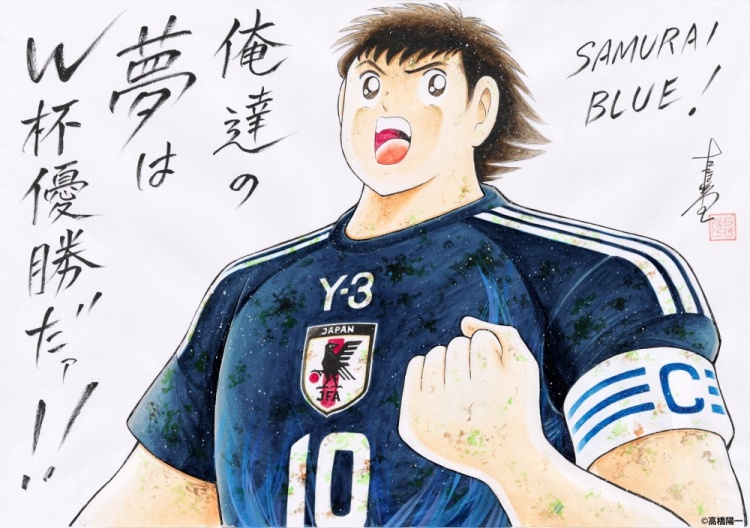 日本隊(duì)官推曬出了一張由《足球小將》作者高橋陽一手繪的大空翼海報(bào),文字內(nèi)容為:“藍(lán)武士!我們的夢(mèng)想是世界杯冠軍!”