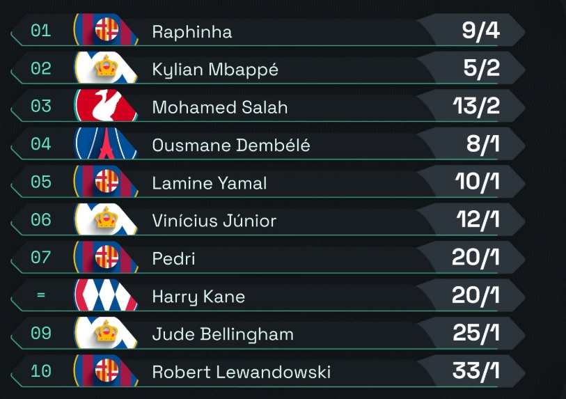 2025-03-18 12:01:34金球獎賠率:拉菲尼亞居首、姆巴佩第二,皇薩球員7人進前十