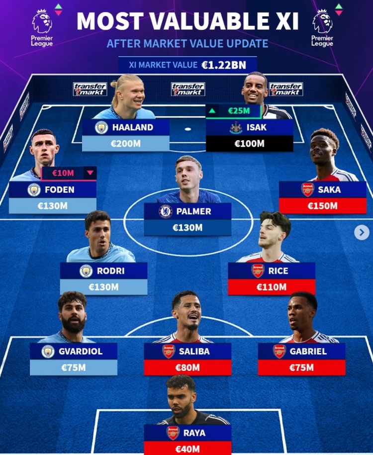 2025-03-19 06:00:22德轉(zhuǎn)列英超最貴陣:阿森納5人、曼城4將,帕爾默、伊薩克在列