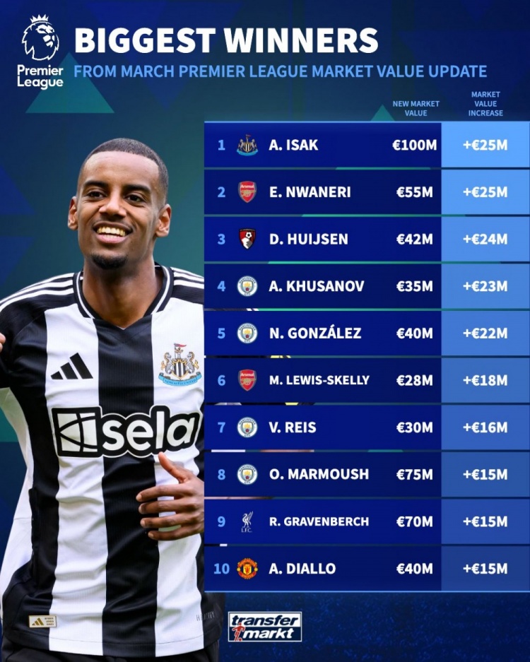 2025-03-19 06:00:32英超球員升值榜:伊薩克&恩瓦內里均漲2500萬,懷森+曼城4將在列