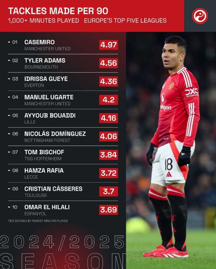 2025-03-19 18:02:34五大聯賽每90分鐘搶斷榜:卡塞米羅居首,亞當斯、蓋耶二三位