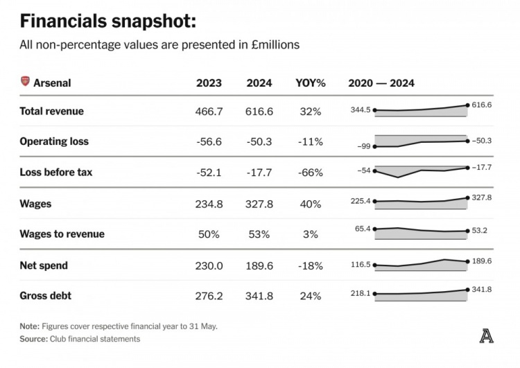 阿森納財務狀況一覽(總收入、運營虧損、稅前虧損、工資、工資收入占比、凈支出、總債務等數據),所有非百分比數值均以百萬英鎊為單位