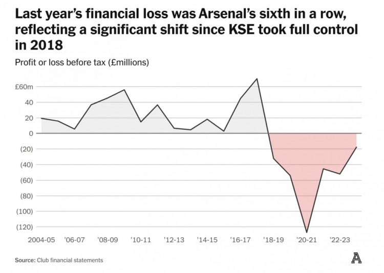 在2018年之后,阿森納連續六年出現財務虧損,也體現了阿森納財務所有權重大轉變后的影響