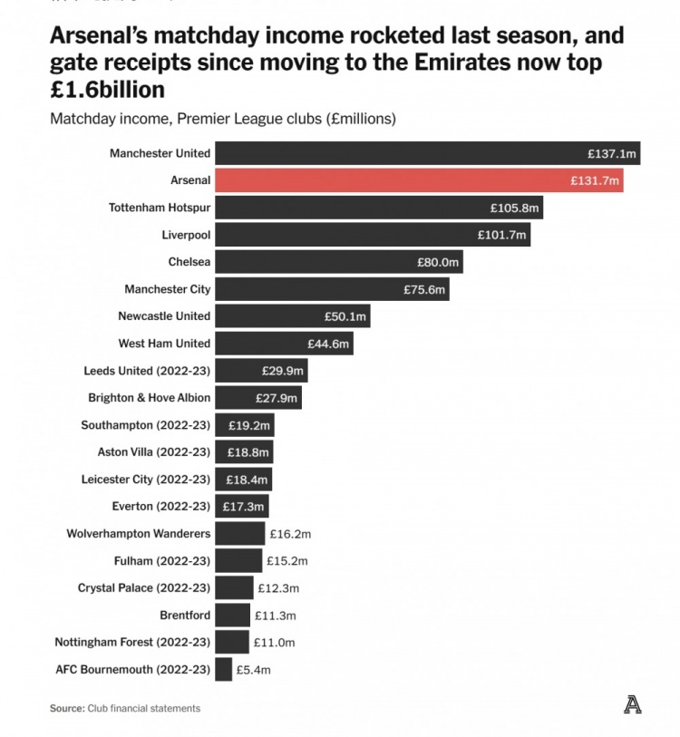 所以,那個賽季阿森納拿下了單賽季隊史最高門票收入,國內比賽日收入躍升聯賽第二位。去年阿森納的比賽日收入僅比曼聯少了550萬英鎊,這也意味著兩隊之間的差距明顯縮小:此前兩個賽季,兩隊的比賽日收入都相差超過3000萬英鎊。盡管酋長球場的建設成本,可能在過去幾年里限制了球隊的發展,但如今搬遷的好處正在越來越明顯。