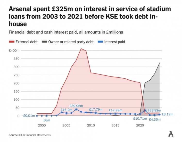 2003年到2021年,KSE內部承擔債務之前,阿森納在球場貸款利息上花費了3.25億英鎊