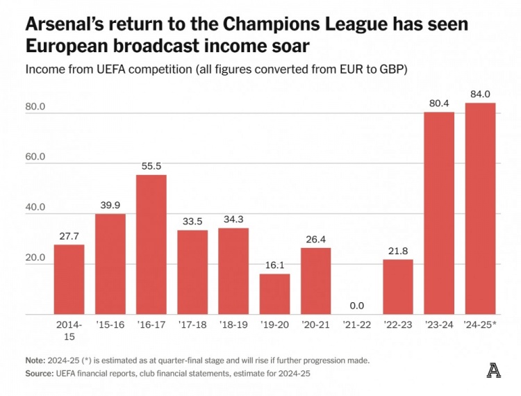即便他們下個月被皇馬淘汰,本賽季也可能成為阿森納在歐戰賽場上收入最高的一次。過去兩個賽季,他們從歐足聯賽事中獲得的獎金估計為1.644億英鎊,幾乎與之前六個賽季的總和(1.658億英鎊)相當。