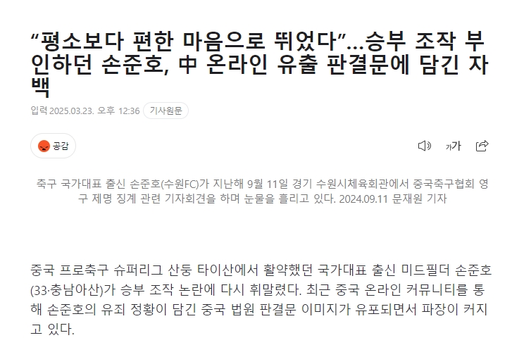 韓媒標(biāo)題:“我比平時(shí)更放松心態(tài)比賽”孫準(zhǔn)浩否認(rèn)操縱比賽,但在中國(guó)網(wǎng)絡(luò)上泄露的判決書中承認(rèn)了這一罪行。