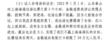 證言中,孫準(zhǔn)浩表示在泰山2-2平海港之前,金敬道說讓慢點(diǎn)踢這場不能贏。賽后,金敬道給孫準(zhǔn)浩20萬人民幣;在2-0河北之前,孫準(zhǔn)浩跟著金敬道下注50萬,這場比賽結(jié)束后金敬道把錢給金敬道姐姐郭今蘭,郭今蘭再給孫準(zhǔn)浩的哥哥。