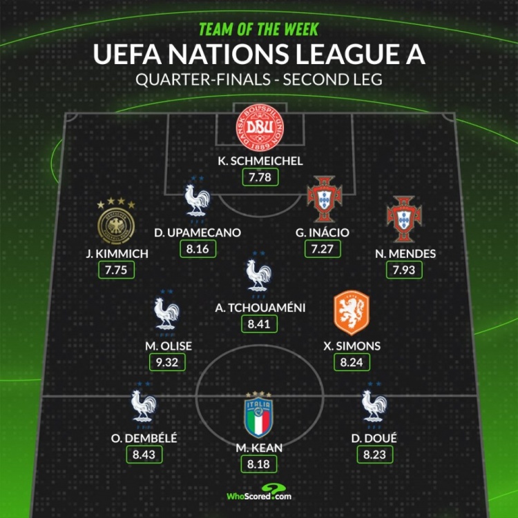 2025-03-24 18:00:21歐國聯8強戰次回合最佳陣:登貝萊領銜法國5將 小基恩&基米希在列