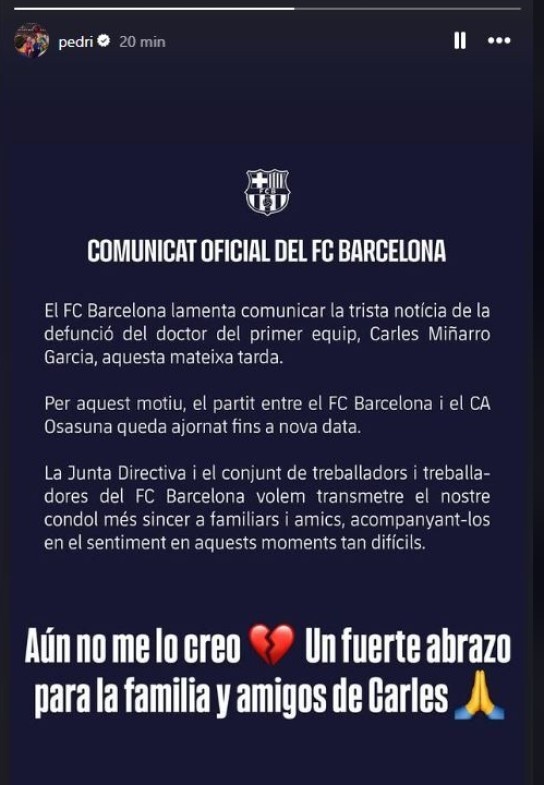 在消息出來后,許多巴薩球員都在社交媒體上悼念了卡萊斯,佩德里轉發了訃告并寫道:“我仍然不敢相信這是真的,給卡萊斯的家人一個大大的擁抱?!?/p>