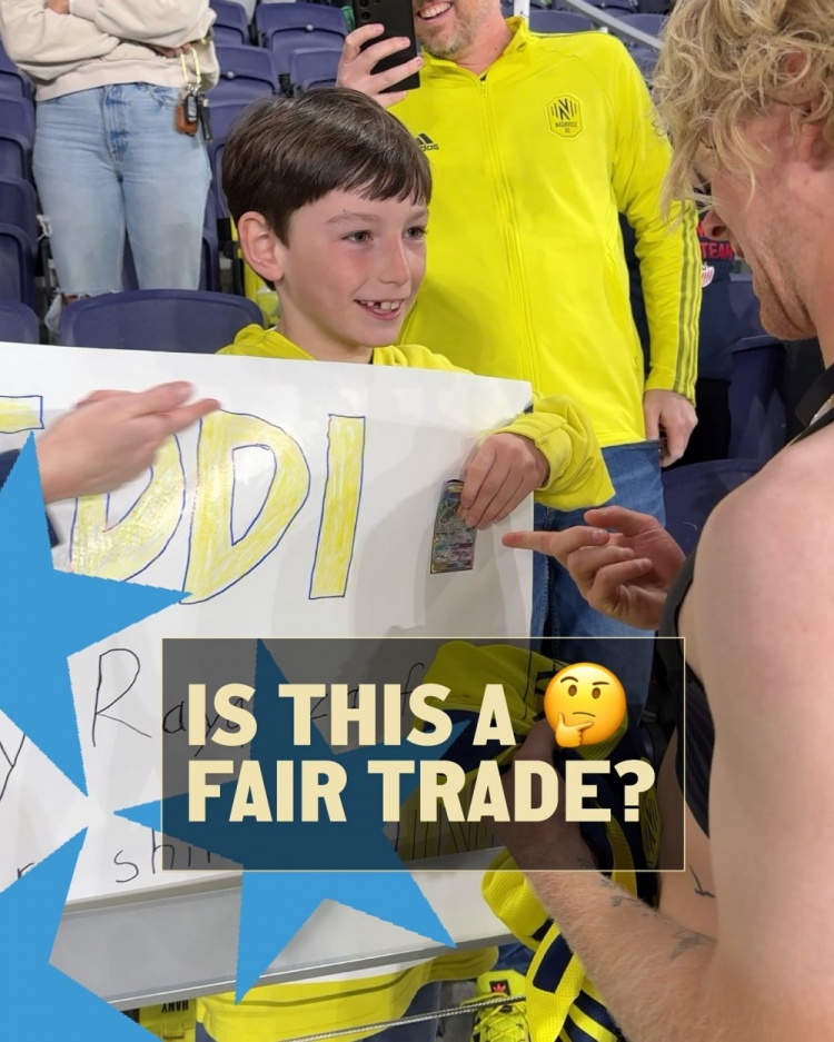 而在納什維爾2-1擊敗蒙特利爾的比賽之后,小球迷拿著自己的烈空坐卡牌找到塔吉斯,并換到了他身上穿著的球衣。