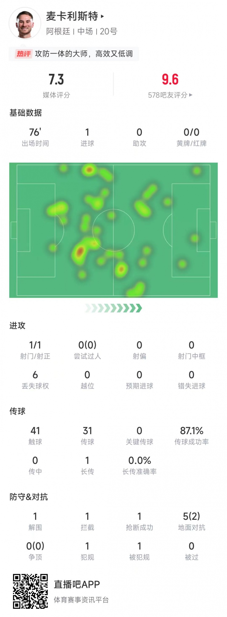 2025-03-26 12:02:01麥卡利斯特本場數據:射門1次打進1球,傳球成功率87.1%&評分7.3